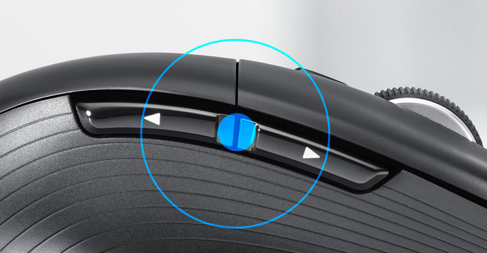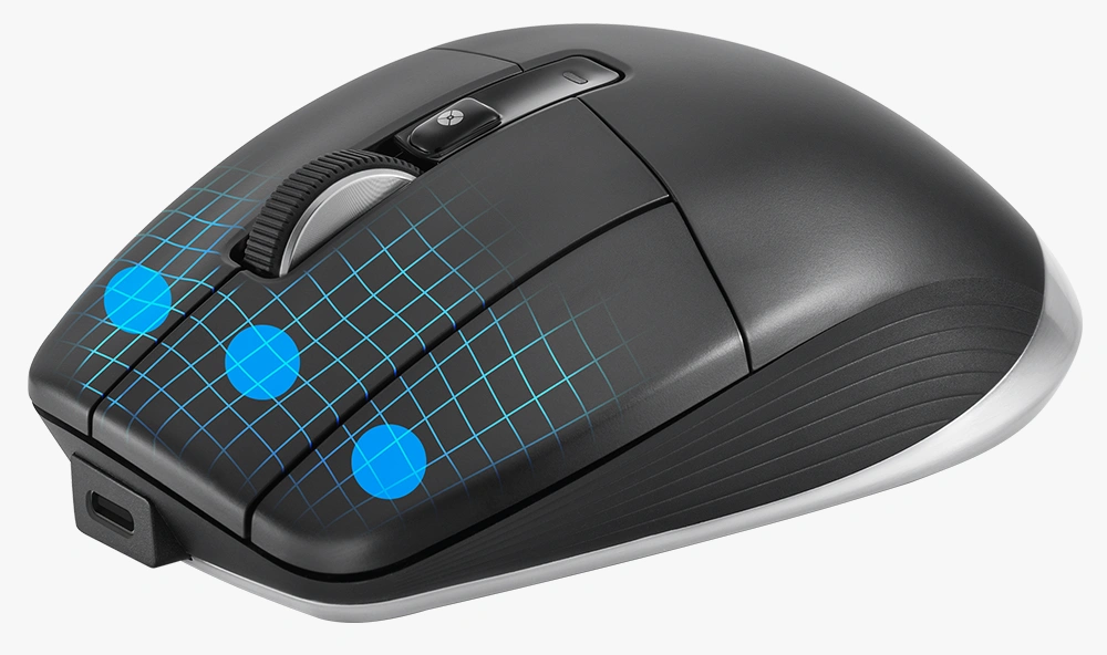 The three main buttons of CadMouse Pro Wireless Left offer a concave design, sculpted to guide the fingertips to their ideal positioning, for an organic, natural feel.