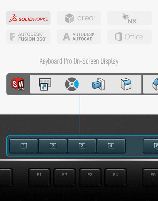 The 3Dconnexion Keyboard Pro features 12 additional function keys located above the standard keys. The keyboard instantly recognizes the applications you are using, as well as their environments. Commands you use most are automatically assigned to the individual keys, so you can access them directly. You can also easily personalize the 3Dconnexion keys according to your preferences.