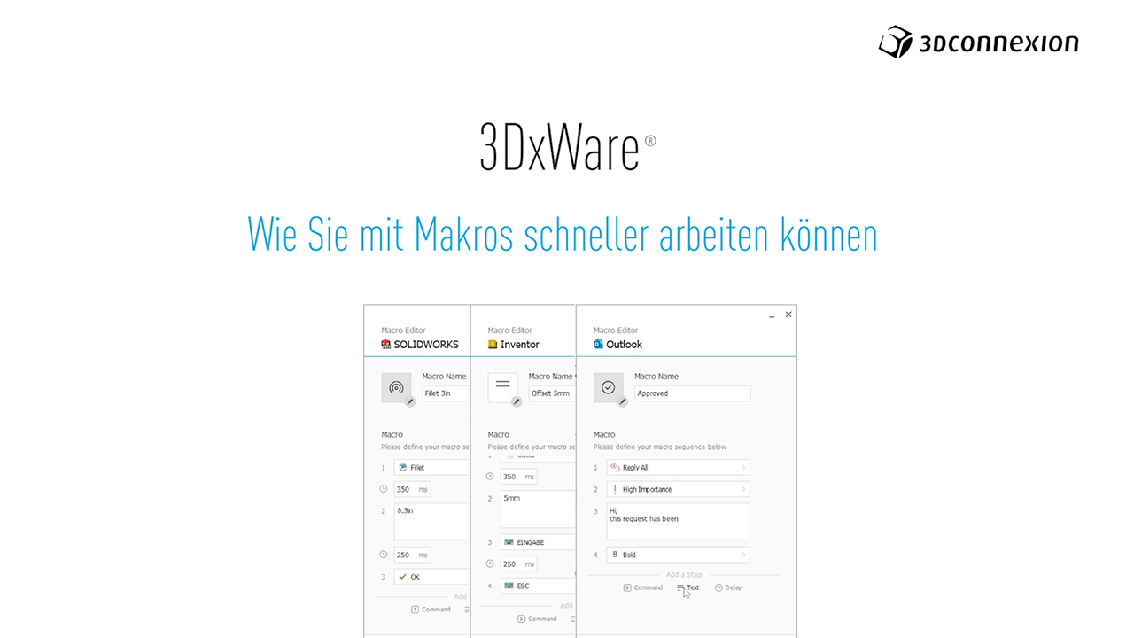 Sparen Sie Zeit sich wiederholende Aufgaben innerhalb einer Anwendung effektiv zu erledigen. Verwenden Sie den leistungsstarken Makro-Editor, der in 3DxWare enthalten ist, um Ihre Aufgaben zu automatisieren.