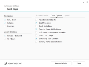 Sketch / Profile: Disable Rotation: When selected, it disables rotation in Sketch mode. The SpaceMouse movement will be limited to zooming. This option is disabled by default.