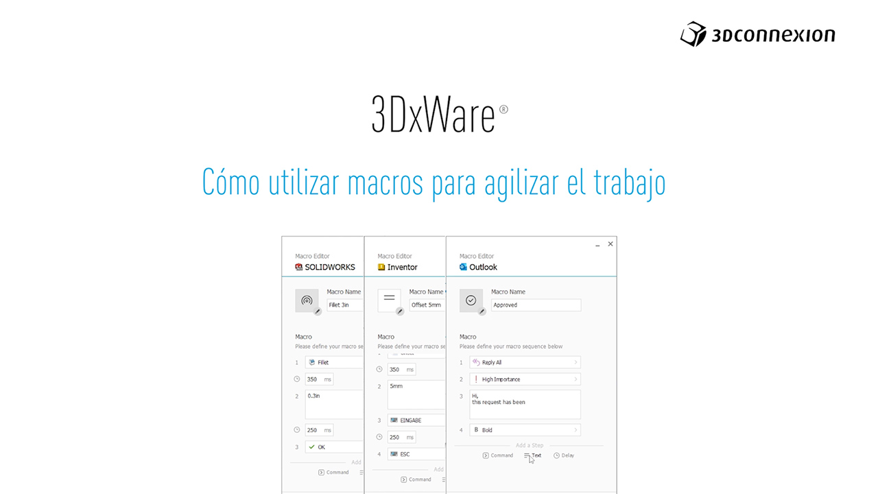 Ahorre tiempo a la hora de realizar tareas repetitivas dentro de una aplicación. Utilice el potente Editor de macros que se incluye con 3DxWare para automatizar sus tareas.
