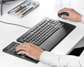 A full-sized palm rest provides support for reduced wrist fatigue. The design of the keyboard allows a flat position on the desk for a relaxed and easy typing.