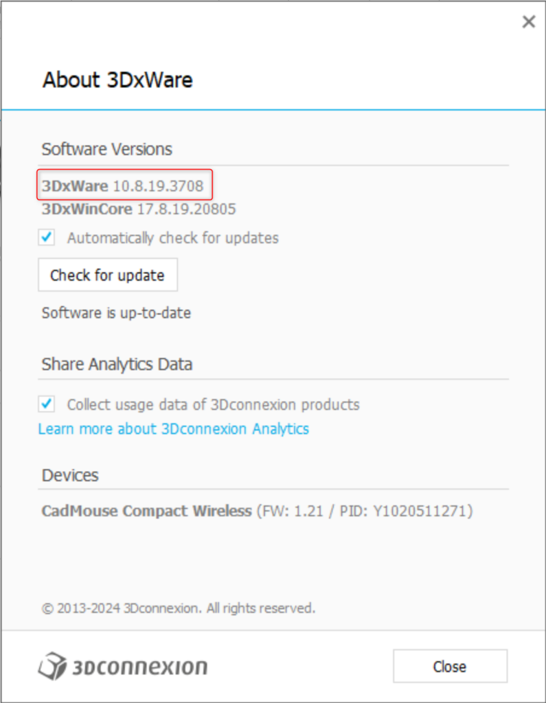 4. On the top you will see the 3DxWare driver version