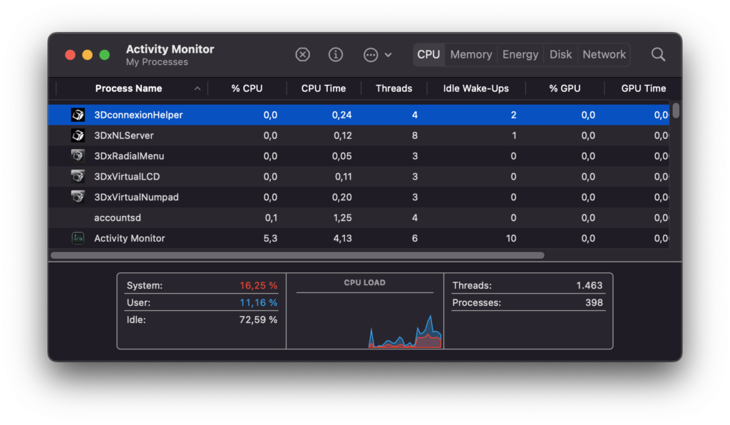 If the SpaceMouse does not work but instead moves the mouse cursor on macOS, the 3DconnexionHelper process is not running.