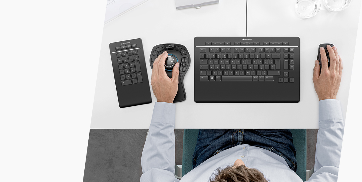 Combinés ensemble, les SpaceMouse 3Dconnexion, Keyboard Pro with Numpad, CadMouse et CadMouse Pad créent un écosystème synergique inégalable avec une souris et un clavier ordinaires. Utilisez notre configurateur de kit pour personnaliser votre propre bureau 3Dconnexion.