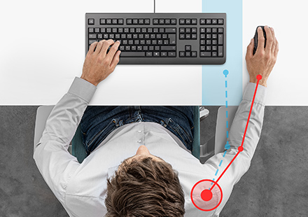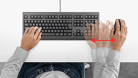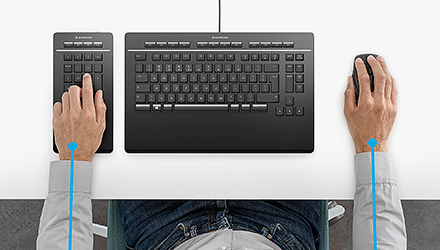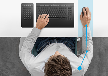 As a full-sized keyboard with detached numpad, the device has a reduced width. This enables a better position of a mouse or pen, resulting in a more natural posture. Creatives and CAD professionals are heavy mouse users. Working with conventional keyboards with integrated numpad leads to an awkward shoulder rotation, as the width requires placing the mouse too far to the right. Research has shown that reduced shoulder rotation associated with the use of a narrow keyboard – such as one with no numpad – results in less muscle fatigue.