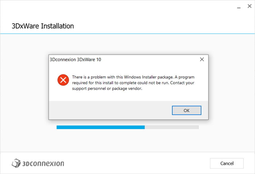 During installation of 3DxWare, the following error may arise with the progress bar at 50% or higher: