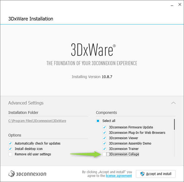 • Under the Components section, uncheck 3Dconexion Collage. Then click “Accept and install”.