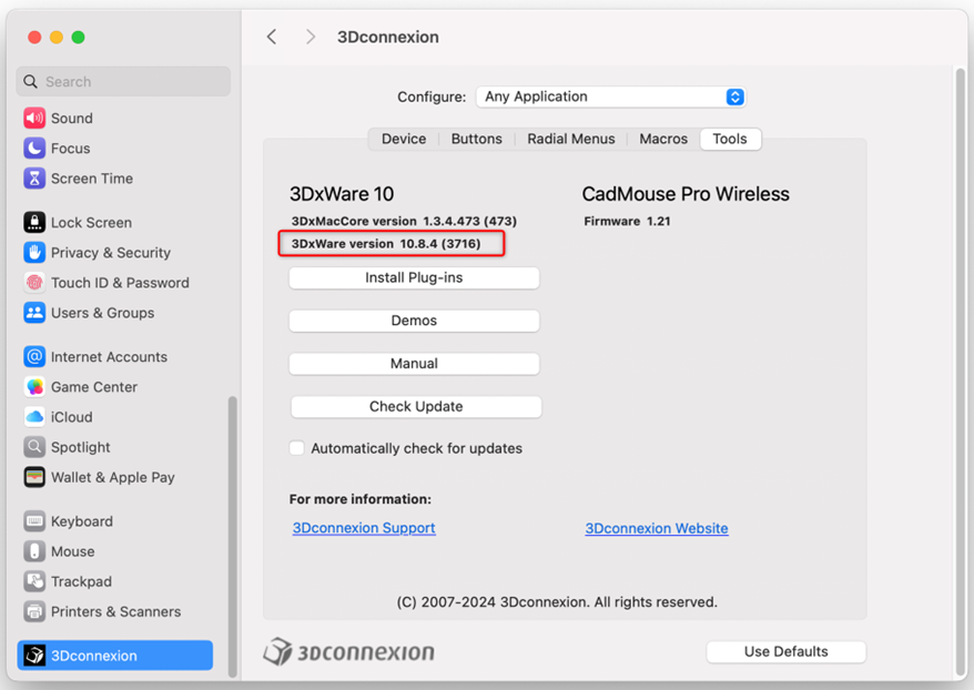 4. On the top you will see 3DxWare driver version