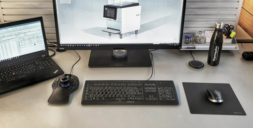 Since the end of 2019, a total of 38 Thermoplan designers have been using the CadMouse Wireless from 3Dconnexion in addition to the SpaceMouse Pro. “The mouse noticeably improves the workflow and helps to exploit the full potential of Solid Edge.” tells Renato Schaible. In CAD applications, the middle mouse button is often used to rotate parts. “With standard mice, this works rather tediously, as pressing the mouse wheel often causes the wheel to turn slightly. As a result, there is also an undesirable zooming in, ”continues Mr. Schaible. To remedy this, 3Dconnexion has integrated the additional middle mouse button in all CadMouse models. This prevents unintentional use of the mouse wheel and, with an average of 60 g less effort, is a lot more ergonomic than clicking on the scroll wheel.