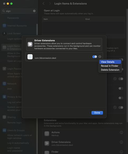- sudo systemextensionsctl uninstall 9D93Y2RD6L com.3dconnexion.dext (Removes only the 3Dxconnexion extension; a reboot will be required later, see point 7)