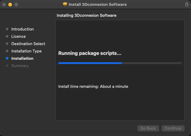 Possible reason for this issue: If your installation is stuck, it might be caused by improper uninstallation of 3Dconnexion driver, likely by dragging the 3Dconnexion folder to the trash. In the future, please use the “Uninstall 3Dconnexion Driver” file to properly uninstall the driver.
