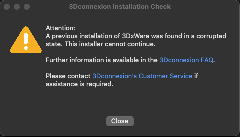 If using 3DxWare for macOS version 10.8.6 or newer, this warning message may be displayed: