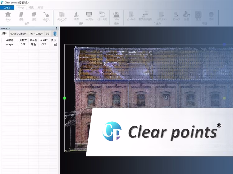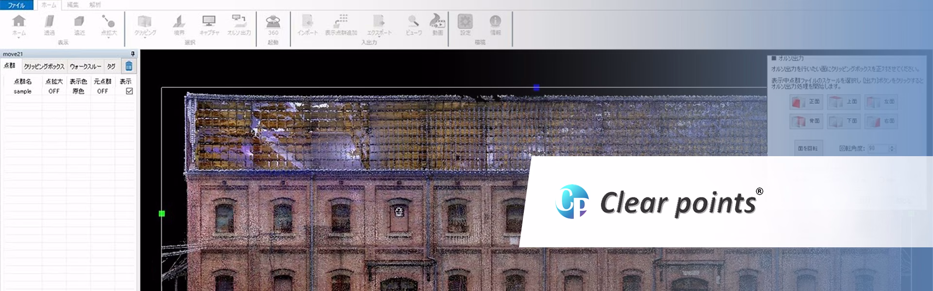 Basic functions include the clear display of large-scale point clouds, clipping, and orthographic output. Simple measurement options include viewer function, interference check, edge enhancement, video output, and external link registration.
