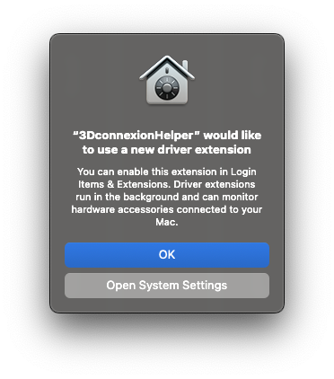 1. After installation is complete, you will see two prompts with information about an extension requiring to be enabled. A system information “System Extension Blocked” with a house icon and a more detailed panel overlayed of “3D Mouse Home”.