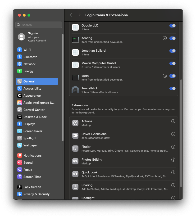 2. Open System SettingsGeneralLogin Items & Extensions.