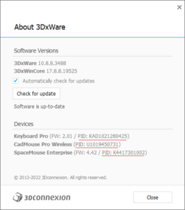 If your device is connected to your Windows computer, the serial number (PID) is shown in the “About” panel of the driver (3Dconnexion Home > Settings > More > About):